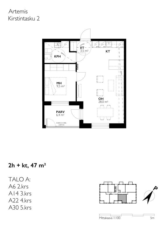 Kalustimme Artemikseen malliksi asunnon A32, 3h + kt + s 63m2.