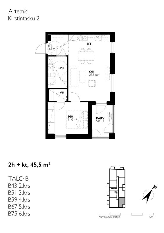 | B 43 | 2. | 2h+kt | 45,5 m² | 761,40 €/kk |